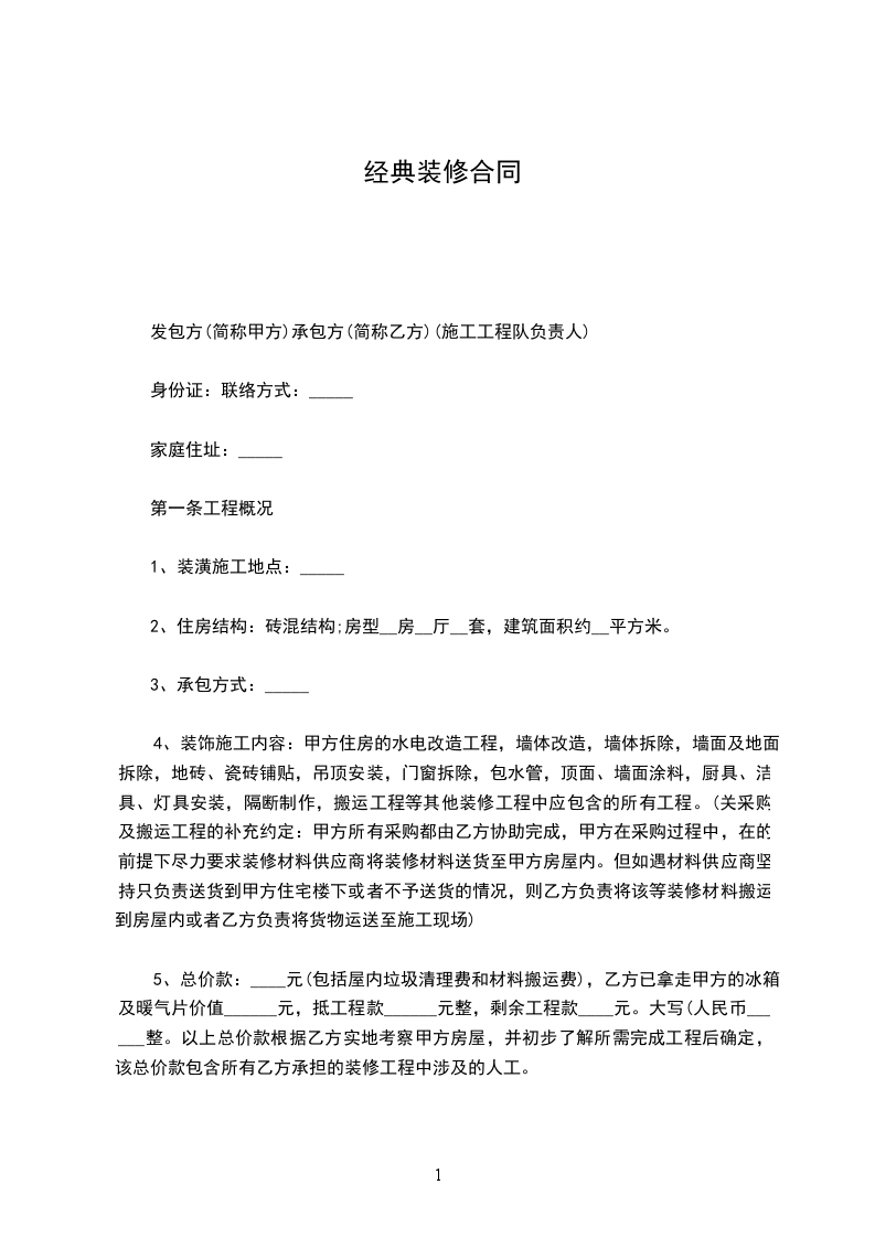 5、总价款:____元(包括屋内垃圾清理费和材料搬运费),乙方已拿走甲方的冰箱及暖气片价值______元,抵工程款______元整,剩余工程款____元。大写(人民币______整。以上总价款根据乙方实地考察甲方房屋,并初步了解所需完成工程后确定,该总价款包含所有乙方承担的装修工程中涉及的人工。