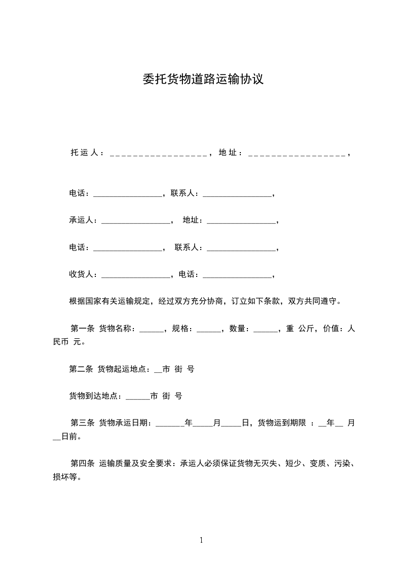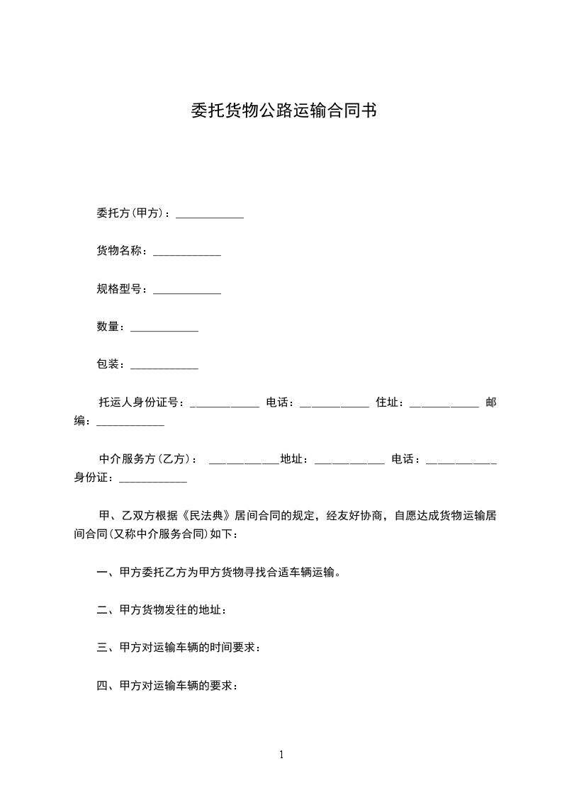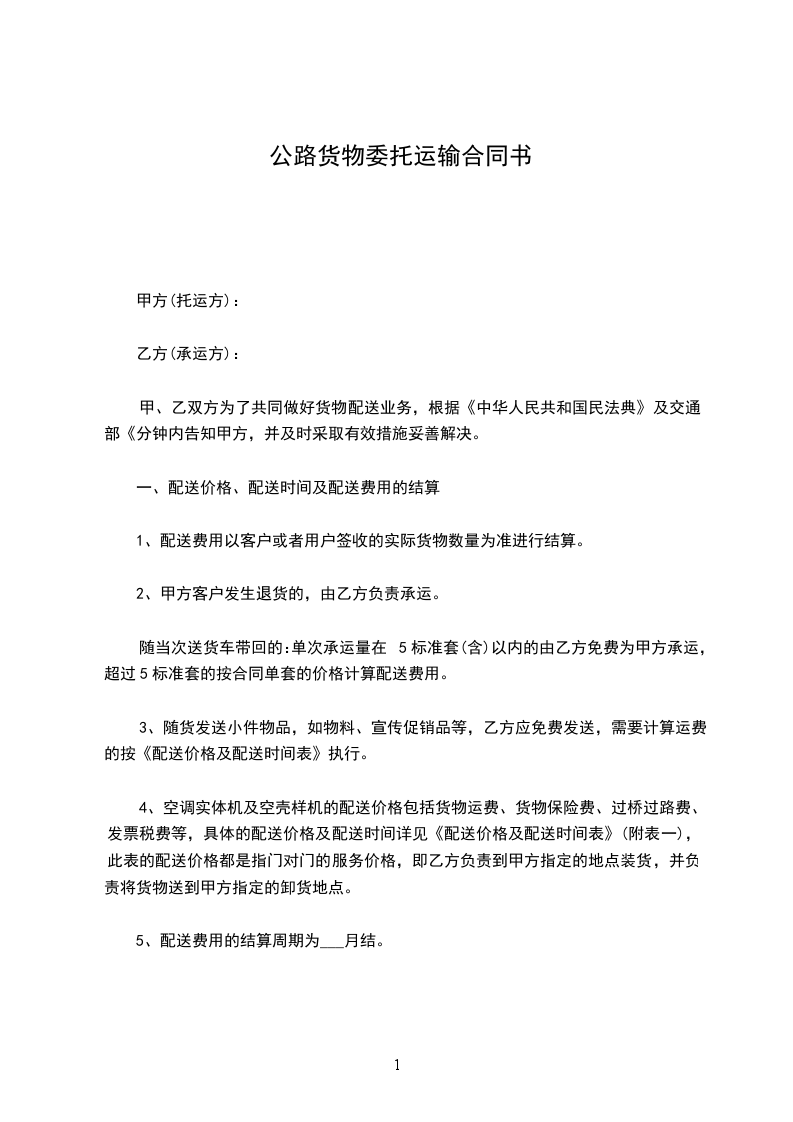 根据甲方与乙方的共同协商,在遵循《民法典》的基础上,就甲方将发往全国各地的货物交给乙方承运事项制定如下条款: