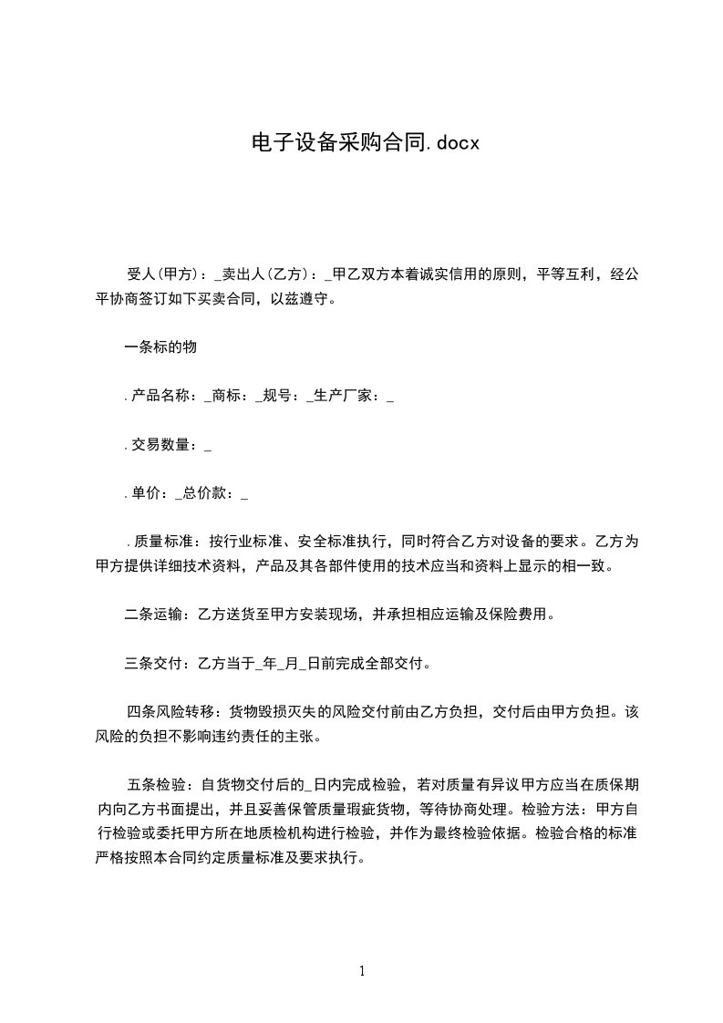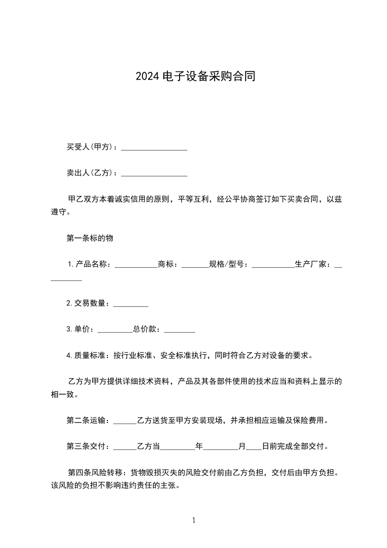 第一条标的名称、品牌、规格、数量、单价及交付时间