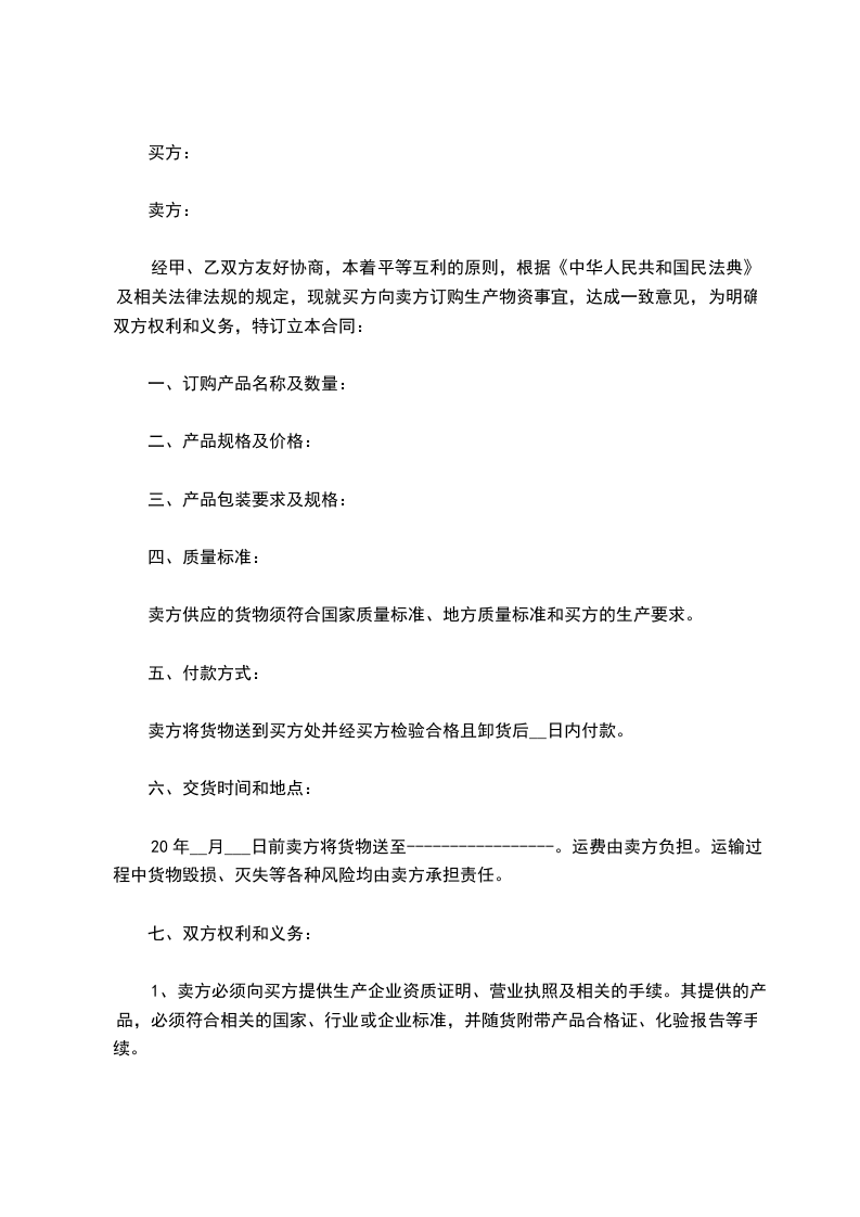 经甲、乙双方友好协商,本着平等互利的原则,根据《中华人民共和国民法典》及相关法律法规的规定,现就买方向卖方订购生产物资事宜,达成一致意见,为明确双方权利和义务,特订立本合同:
