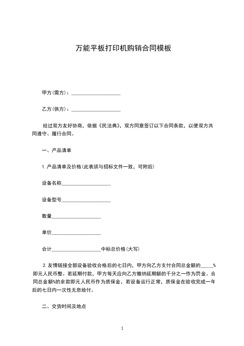 1.交货时间:(投标文件承诺时间)。若延期交货,乙方每天应向甲方缴纳延期额的千分之一作为罚金。因不可抗拒力所导致的交货,服务及付款延迟等按照《民法典》有关条文处理。