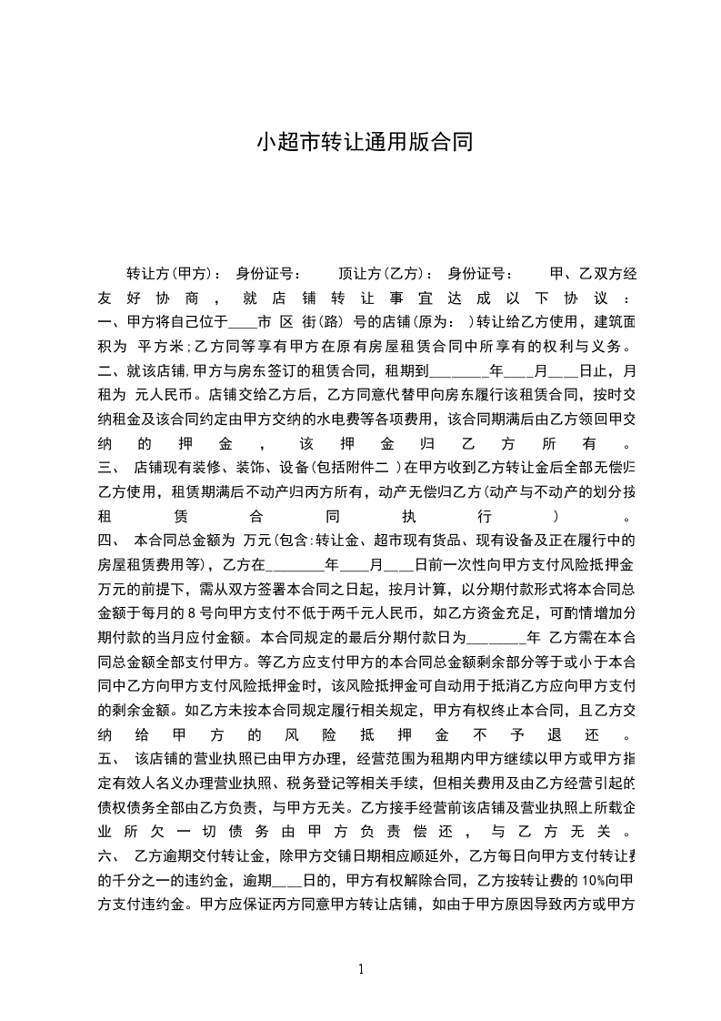 转让方(甲方): 身份证号: 顶让方(乙方): 身份证号: 甲、乙双方经友好协商,就店铺转让事宜达成以下协议: