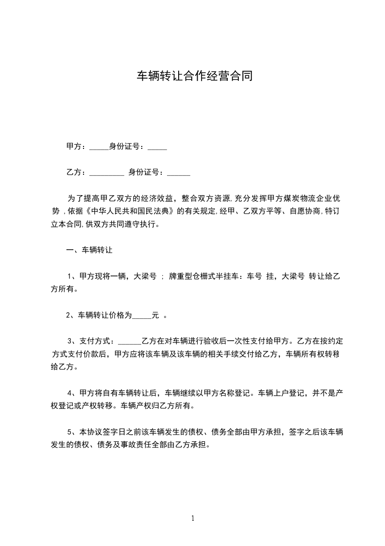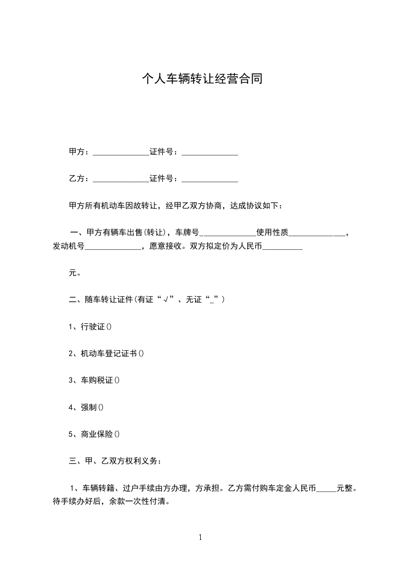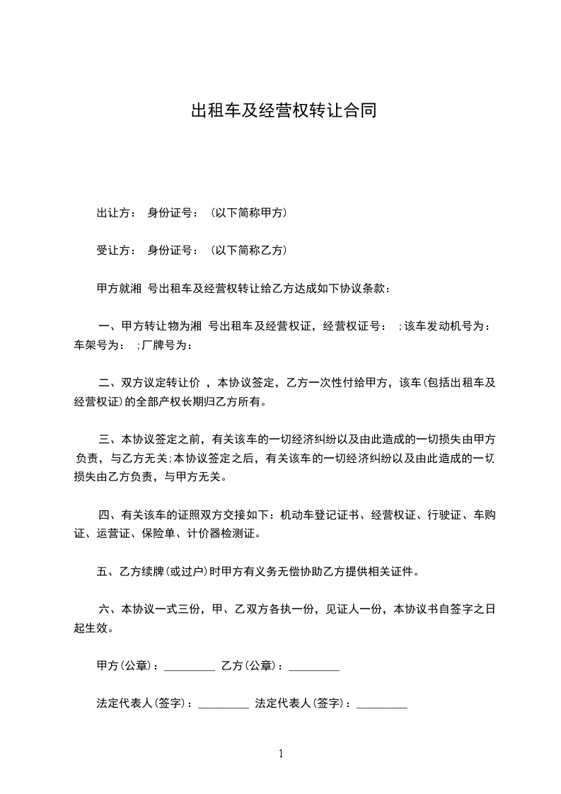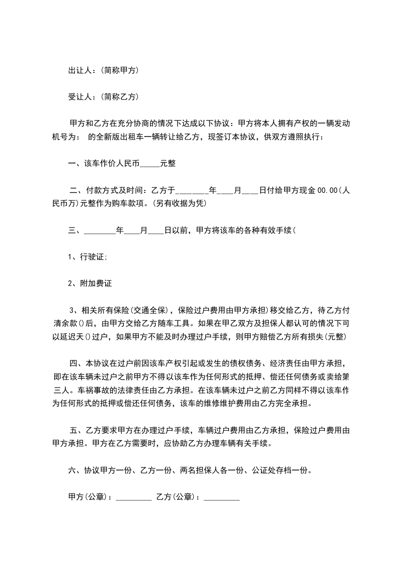 甲方和乙方在充分协商的情况下达成以下协议:甲方将本人拥有产权的一辆发动机号为: 的全新版出租车一辆转让给乙方,现签订本协议,供双方遵照执行: