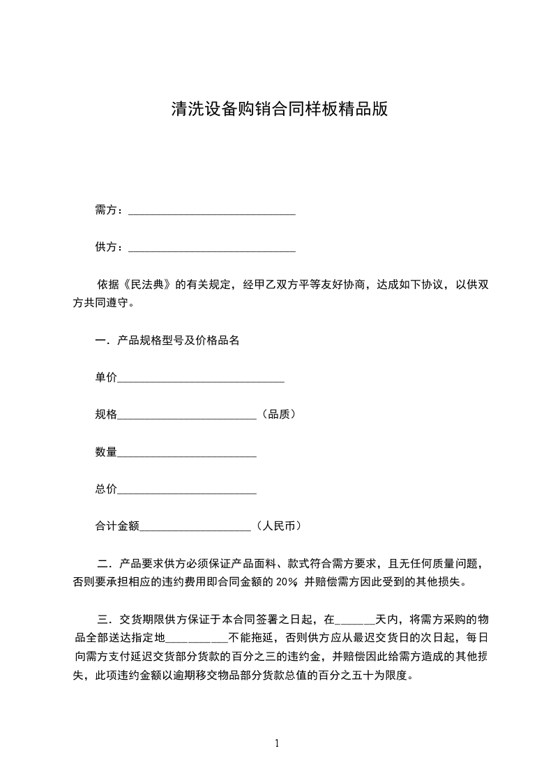二.产品要求供方必须保证产品面料、款式符合需方要求,且无任何质量问题,否则要承担相应的违约费用即合同金额的20%,并赔偿需方因此受到的其他损失。
