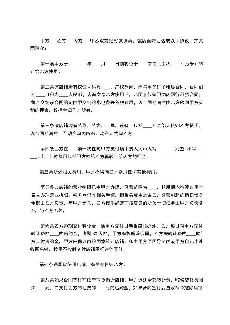 甲方: 乙方: 丙方: 甲乙双方经好友协商,就店面转让达成以下协议:并共同遵守: