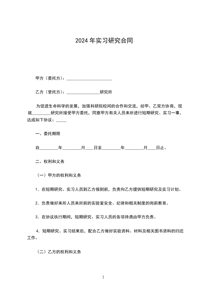 为促进生命科学的发展,加强科研院校间的合作和交流,经甲、乙双方协商,现就_________研究所接受甲方委托,同意甲方有关人员来所进行短期研究、实习一事,达成如下协议:_____