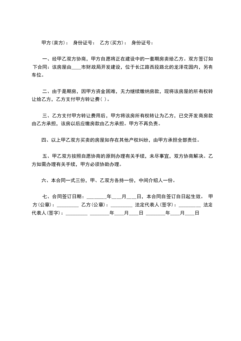 一、经甲乙双方协商,甲方自愿将正在建设中的一套期房卖给乙方。双方签订如下合同:该房屋由____市财政局开发建设,位于长江路西段路北的龙泽花园内,另有车位。