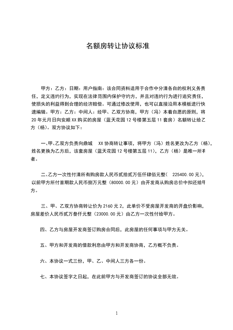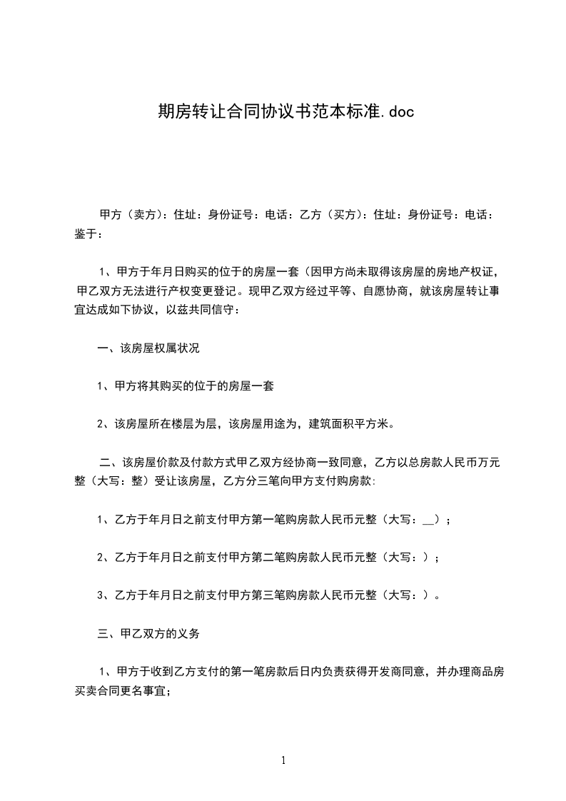 二、由于是期房,因甲方资金困难,无力继续缴纳房款,现将该房屋的所有权转让给乙方,乙方支付甲方转让费( )。