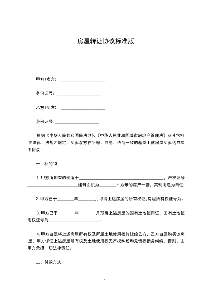 甲方(卖方): 身份证号: 乙方(买方): 身份证号: