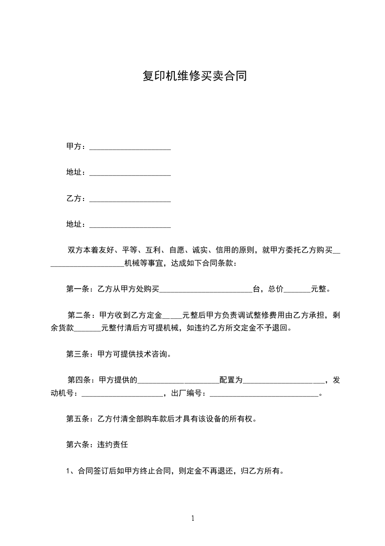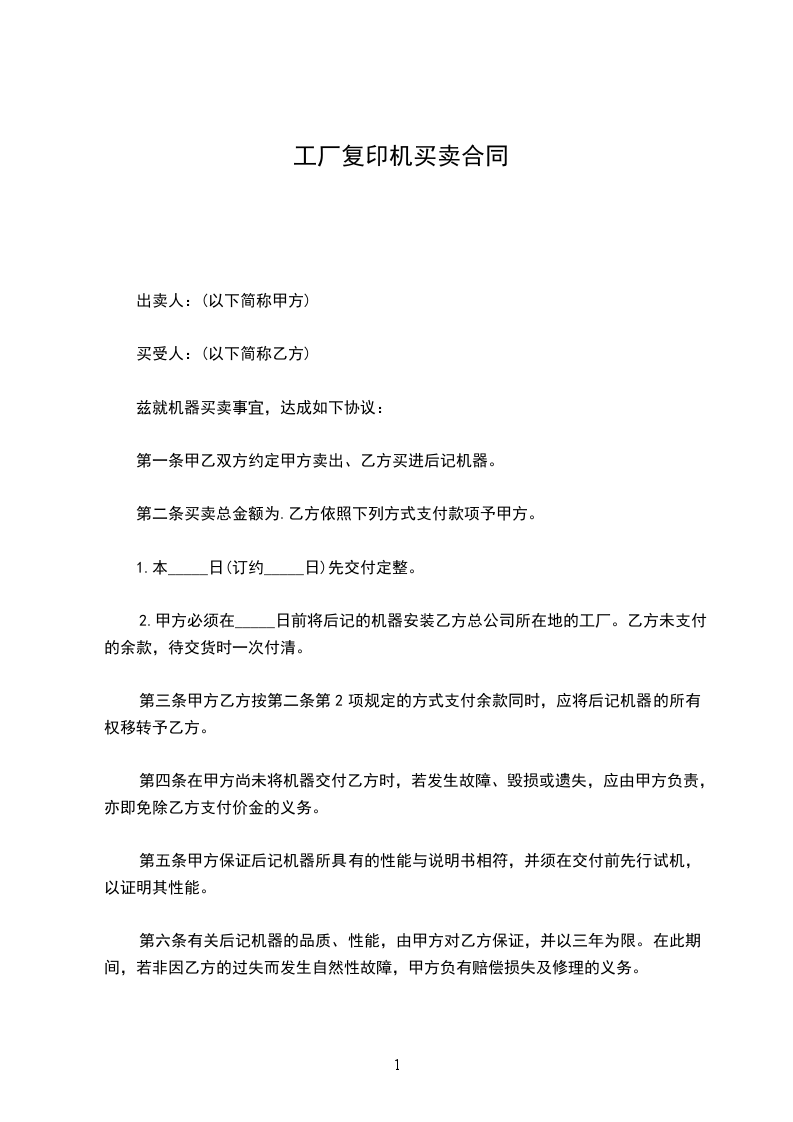 第一条甲乙双方约定甲方卖出、乙方买进后记机器。