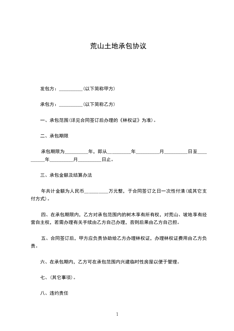 为开发本地资源,响应政府倡导和鼓励兴办民营企业、推动我区经济发展。根据《中华人民共和国土地管理法》、《中华人民共和国农村土地承包法》、《中华人民共和国民法典》等有关法律规定,甲方依照公开、公正、公平的原则,经村民代表会议研究通过,将项下集体所有的荒山承包给乙方经营建厂,双方本着自愿、平等、有偿的原则,签订本合同,具体条款如下:_______
