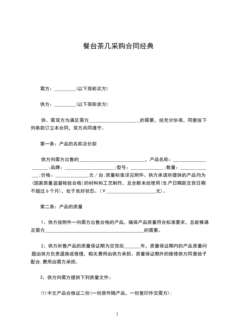 供方向需方出售的____________________________,产品名称:_____________________;品牌:_____________________;型号:______________;数量:______________;价格:______________元∕台;质量标准详见附件。供方承诺所提供的产品均为(国家质量监督检验合格)的材料和工艺制作,且全新未经使用(生产日期距交货日期不超过6个月),处于良好状态。(¥_____________________元)。