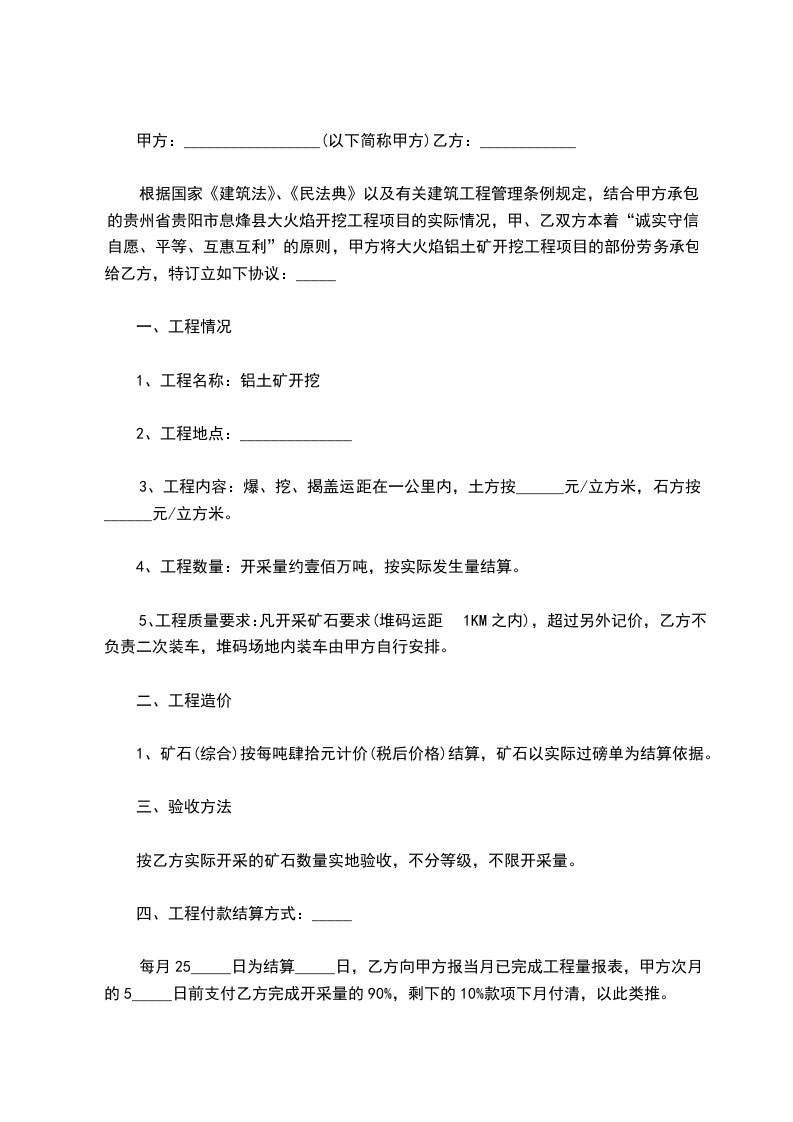 根据国家《建筑法》、《民法典》以及有关建筑工程管理条例规定,结合甲方承包的贵州省贵阳市息烽县大火焰开挖工程项目的实际情况,甲、乙双方本着“诚实守信、自愿、平等、互惠互利”的原则,甲方将大火焰铝土矿开挖工程项目的部份劳务承包给乙方,特订立如下协议:_____
