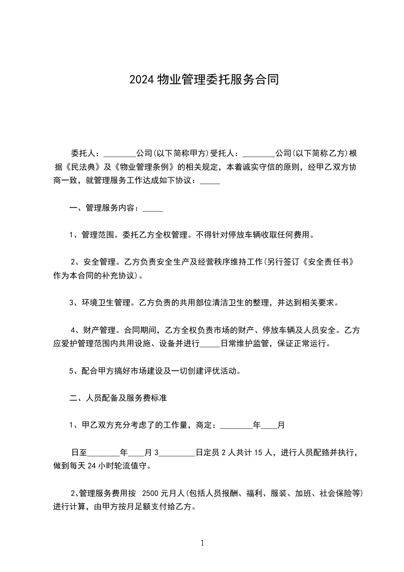 委托人:________公司(以下简称甲方)受托人:________公司(以下简称乙方)根据《民法典》及《物业管理条例》的相关规定,本着诚实守信的原则,经甲乙双方协商一致,就管理服务工作达成如下协议:_____