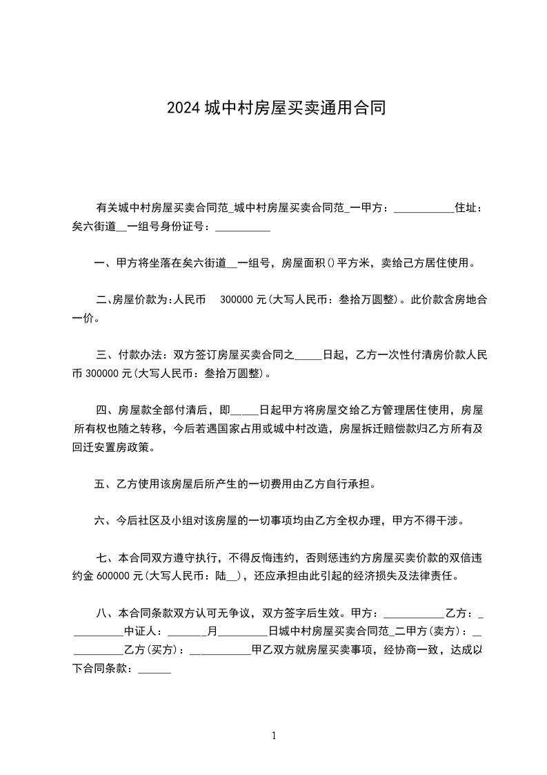 八、本合同条款双方认可无争议,双方签字后生效。甲方:___________乙方:__________中证人:_______月_________日城中村房屋买卖合同范_二甲方(卖方):___________乙方(买方):___________甲乙双方就房屋买卖事项,经协商一致,达成以下合同条款:______
