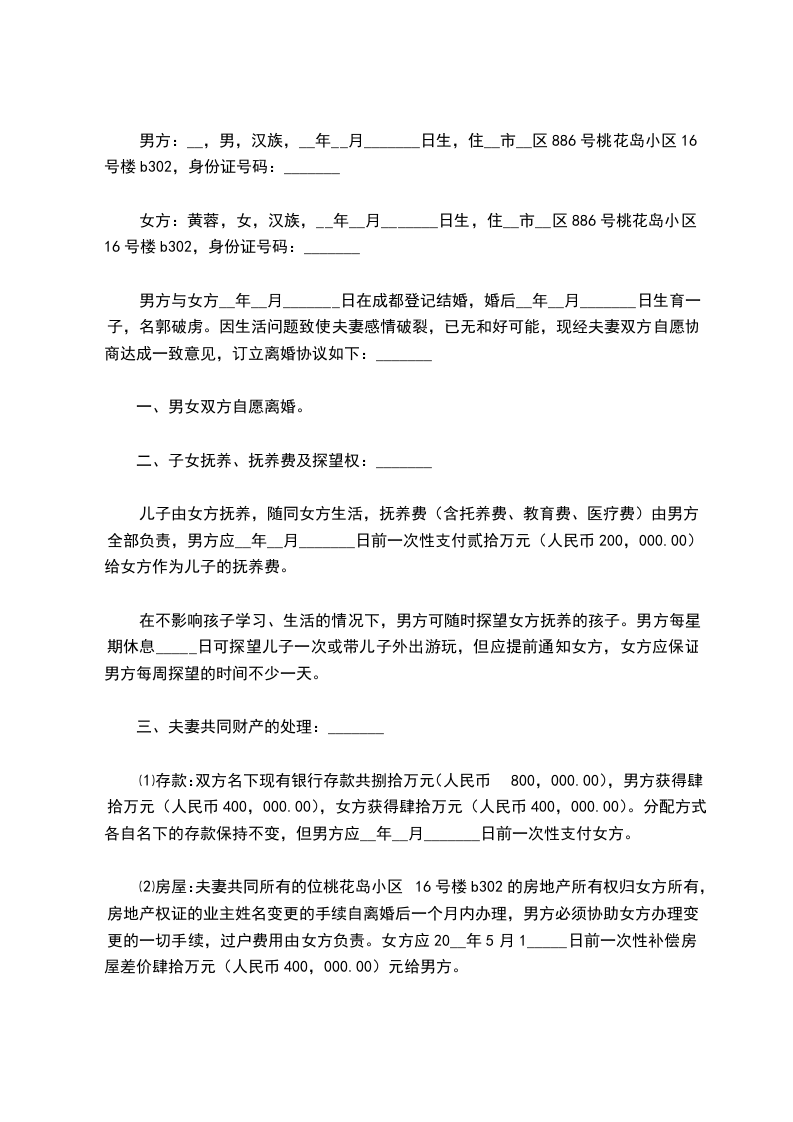 女方:黄蓉,女,汉族,__年__月_______日生,住__市__区886号桃花岛小区16号楼b302,身份证号码:_______