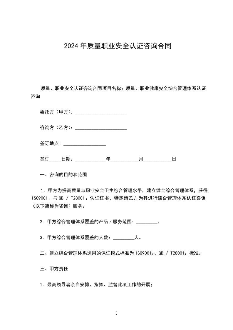 1.甲方为提高质量与职业安全卫生综合管理水平,建立健全综合管理体系,获得ISO9001:与GB/T28001:认证证书,特邀请乙方为其进行综合管理体系认证咨询(以下简称为咨询)服务。