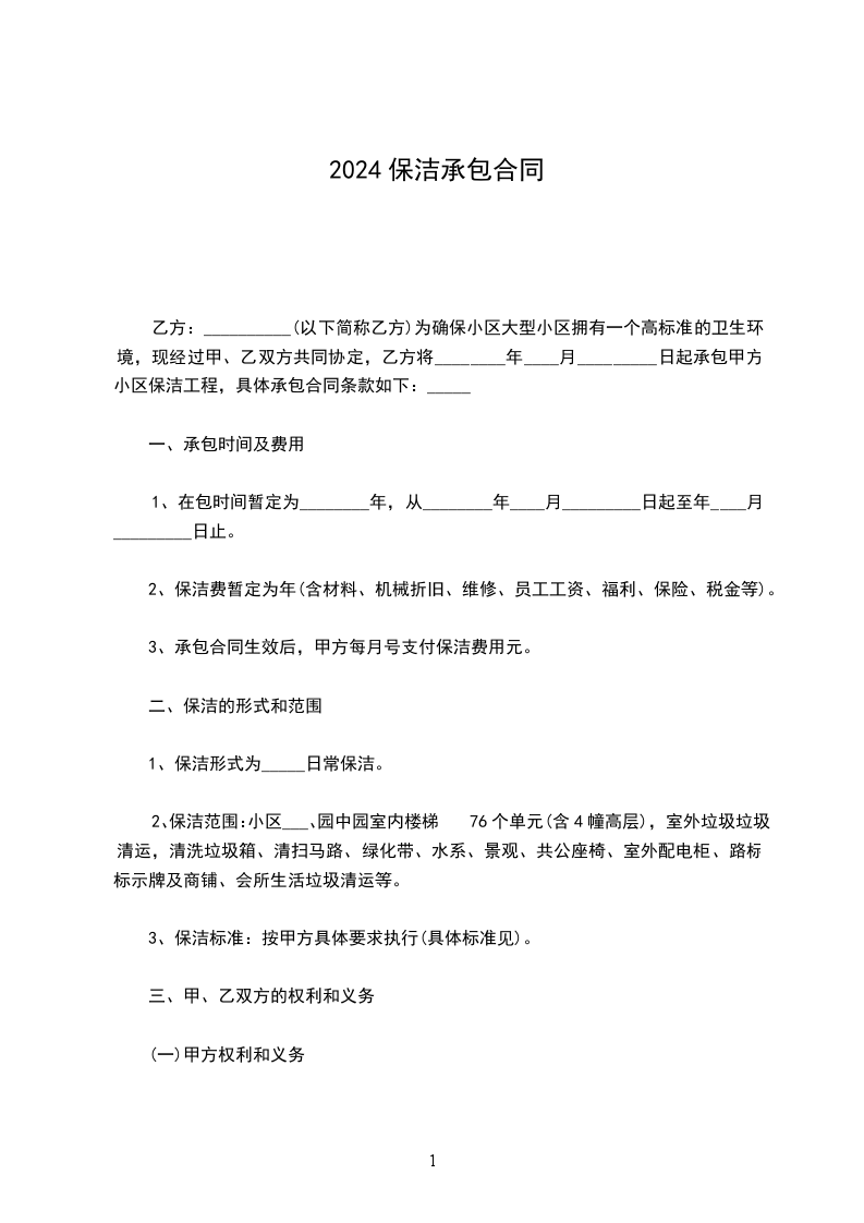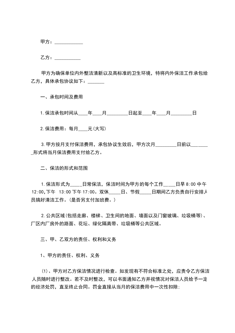 乙方:__________(以下简称乙方)为确保小区大型小区拥有一个高标准的卫生环境,现经过甲、乙双方共同协定,乙方将________年____月_________日起承包甲方小区保洁工程,具体承包合同条款如下:_____