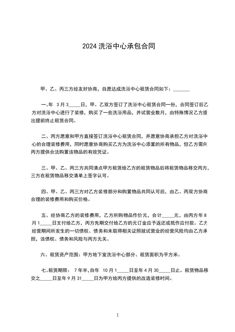甲、乙、丙三方经友好协商,自愿达成洗浴中心租赁合同如下:_______