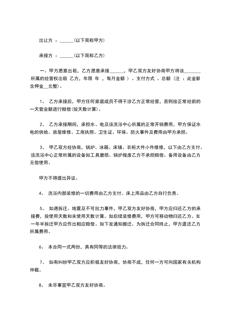 (一)甲方为丙方办理开办洗浴中心所需的一切手续,包括营业执照、税务登记证、消防、环保、卫生防疫等一切手续。