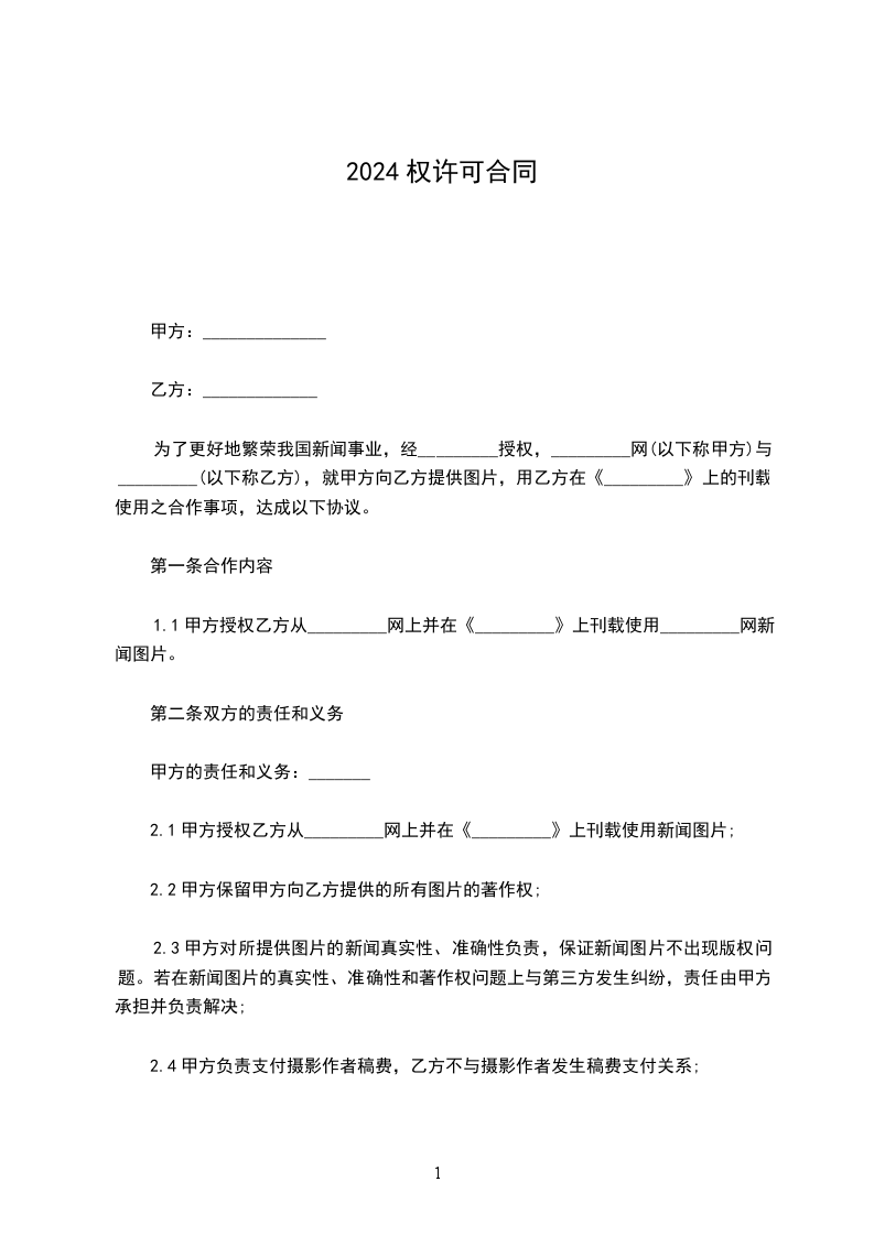 1.1甲方授权乙方从_________网上并在《_________》上刊载使用_________网新闻图片。