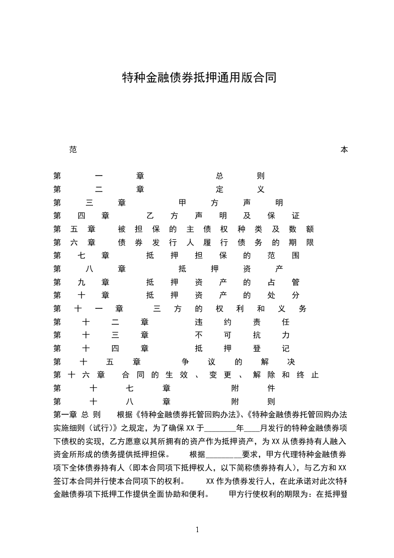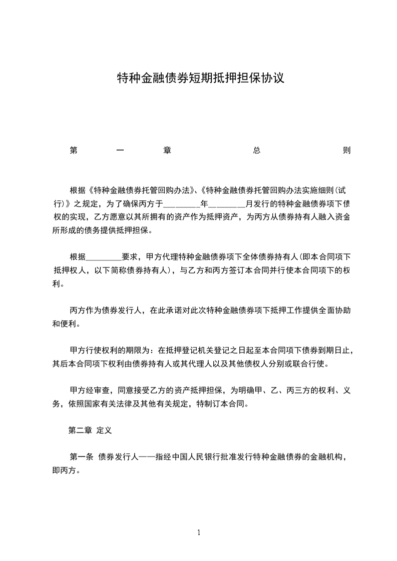 第一章 总 则 根据《特种金融债券托管回购办法》、《特种金融债券托管回购办法实施细则(试行)》之规定,为了确保XX于________年____月发行的特种金融债券项下债权的实现,乙方愿意以其所拥有的资产作为抵押资产,为XX从债券持有人融入资金所形成的债务提供抵押担保。 根据_________要求,甲方代理特种金融债券项下全体债券持有人(即本合同项下抵押权人,以下简称债券持有人),与乙方和XX签订本合同并行使本合同项下的权利。 XX作为债券发行人,在此承诺对此次特种金融债券项下抵押工作提供全面协助和便利。 甲方行使权利的期限为:在抵押登记机关登记之日起至本合同项下债券到期日止,其后本合同项下权利由债券持有人或其代理人以及其他债权人分别或联合行使。 甲方经审查,同意接受乙方的资产抵押担保,为明确甲、乙、丙三方的权利、义务,依照国家有关法律及其他有关规定,特制订本合同。