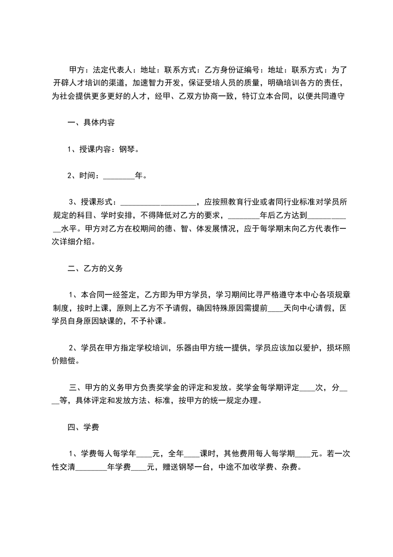甲方:法定代表人:地址:联系方式:乙方身份证编号:地址:联系方式:为了开辟人才培训的渠道,加速智力开发,保证受培人员的质量,明确培训各方的责任,为社会提供更多更好的人才,经甲、乙双方协商一致,特订立本合同,以便共同遵守。