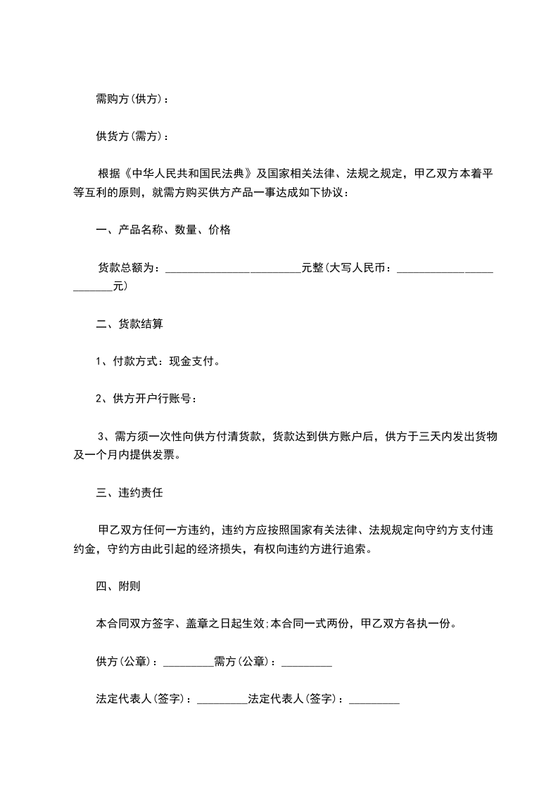 根据《中华人民共和国民法典》及国家相关法律、法规之规定,甲乙双方本着平等互利的原则,就需方购买供方产品一事达成如下协议: