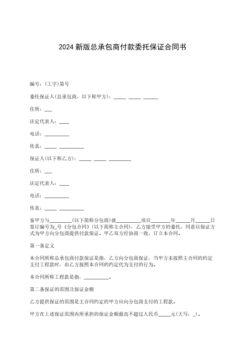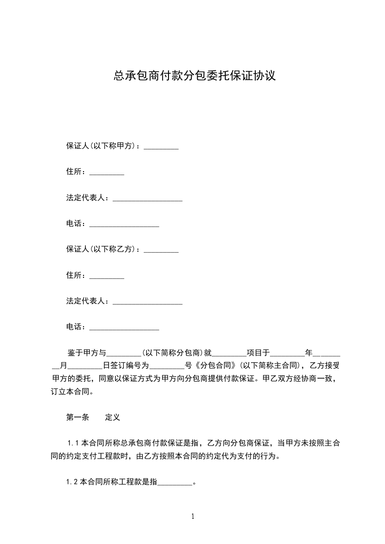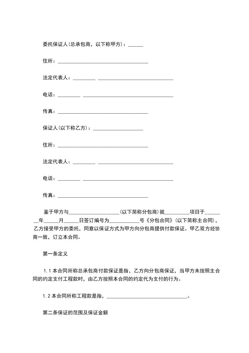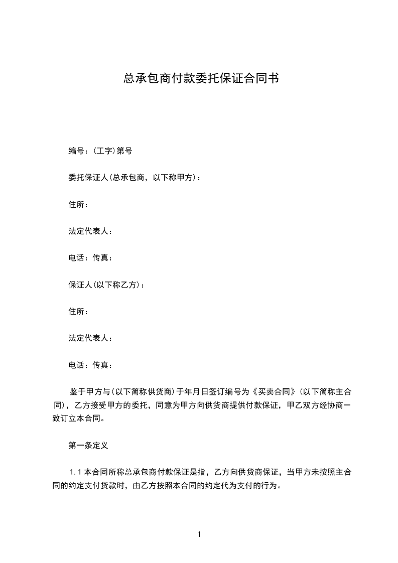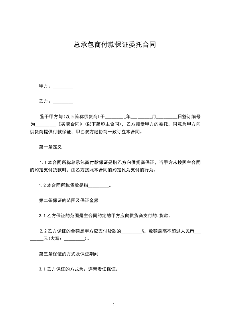1.1本合同所称总承包商付款保证是指,乙方向供货商保证,当甲方未按照主合同的约定支付货款时,由乙方按照本合同的约定代为支付的行为。