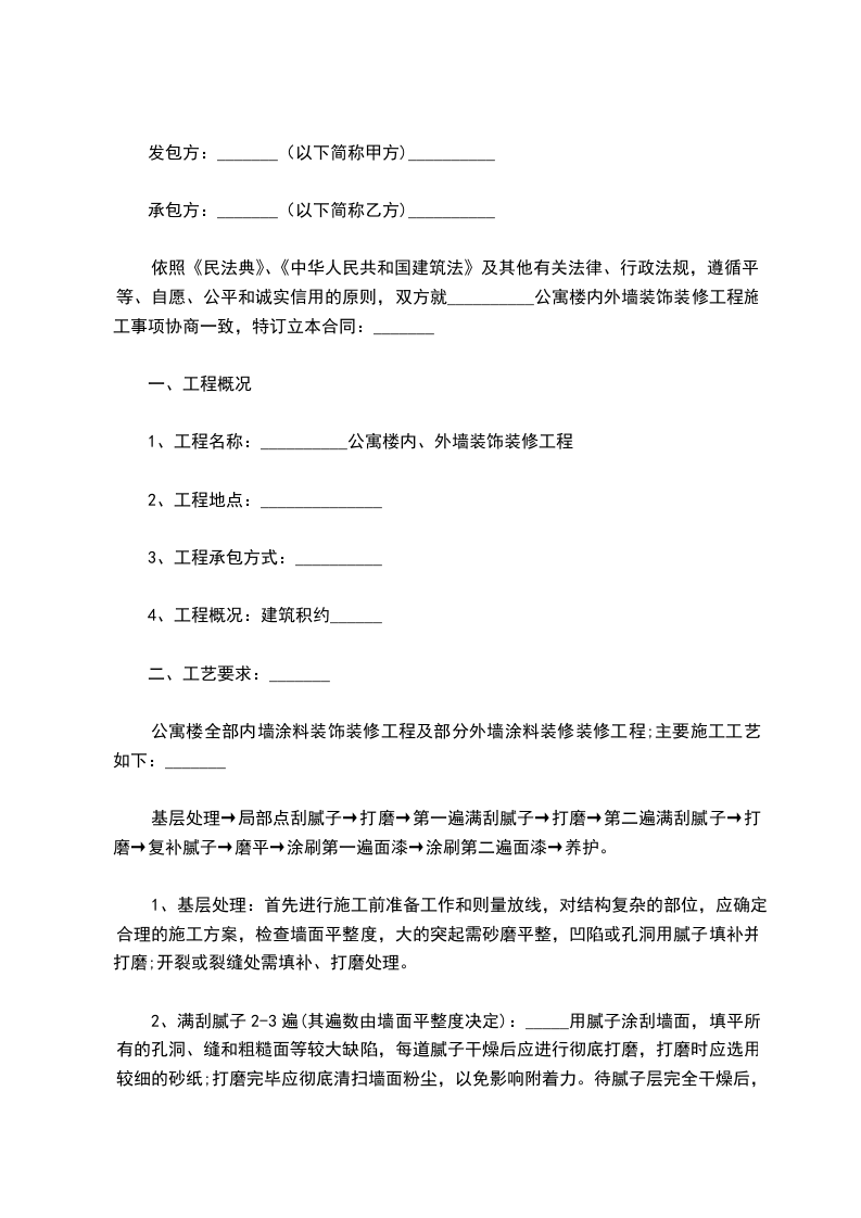 依照《民法典》、《中华人民共和国建筑法》及其他有关法律、行政法规,遵循平等、自愿、公平和诚实信用的原则,双方就__________公寓楼内外墙装饰装修工程施工事项协商一致,特订立本合同:_______