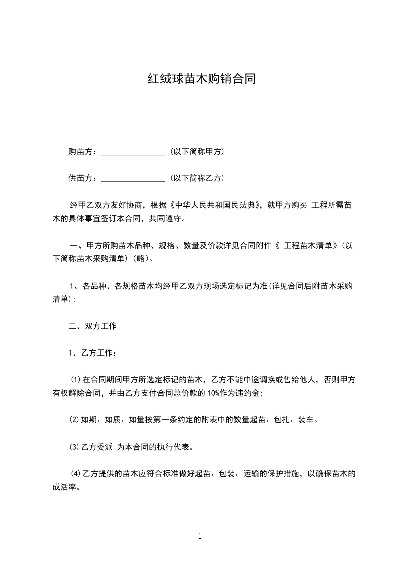 经甲乙双方友好协商,根据《中华人民共和国民法典》,就甲方购买 工程所需苗木的具体事宜签订本合同,共同遵守。