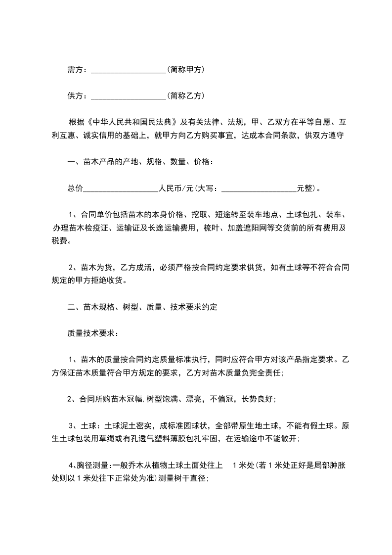 1、苗木的质量按合同约定质量标准执行,同时应符合甲方对该产品指定要求。乙方保证苗木质量符合甲方规定的要求,乙方对苗木质量负完全责任;