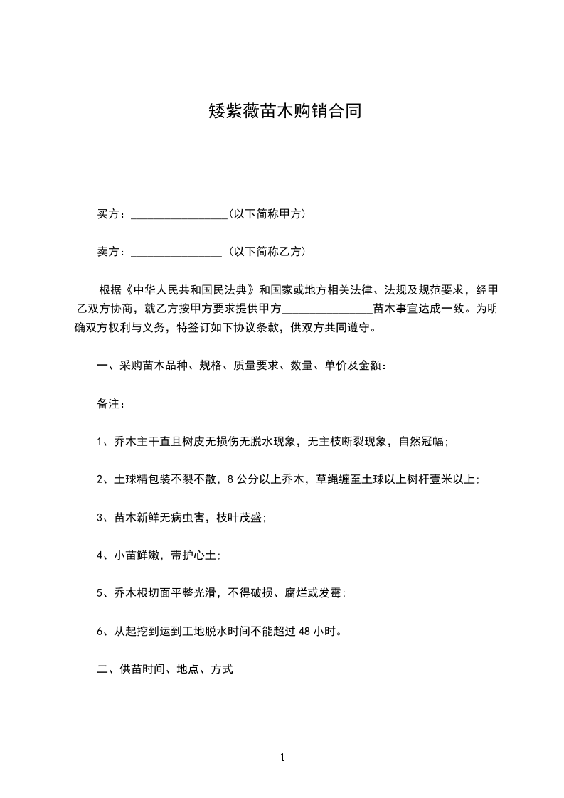 根据《中华人民共和国民法典》和国家或地方相关法律、法规及规范要求,经甲乙双方协商,就乙方按甲方要求提供甲方________________苗木事宜达成一致。为明确双方权利与义务,特签订如下协议条款,供双方共同遵守。