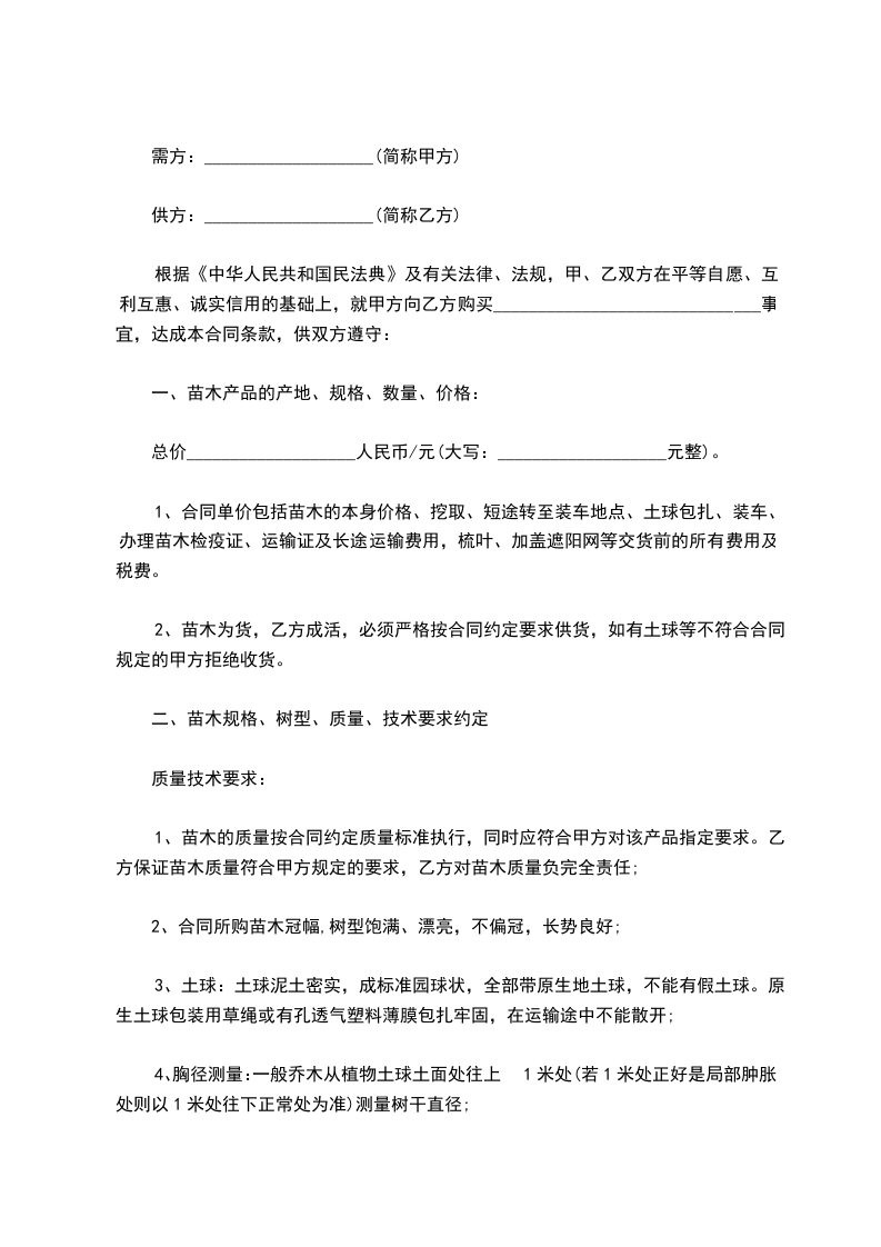 甲方向乙方采购苗木______株,金额为______人民币。甲方与乙方按实际采购苗木数量,按实结算。
