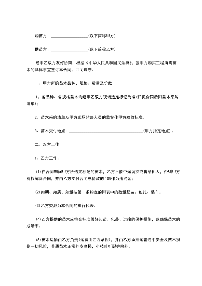 一、甲方向乙方采购苗木_____棵,金额为________________________________________元整、甲方与乙方按实际采购苗木数量,按实际结算。