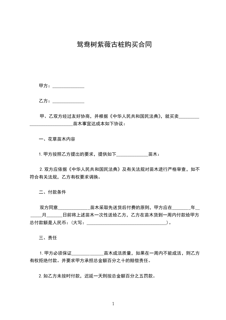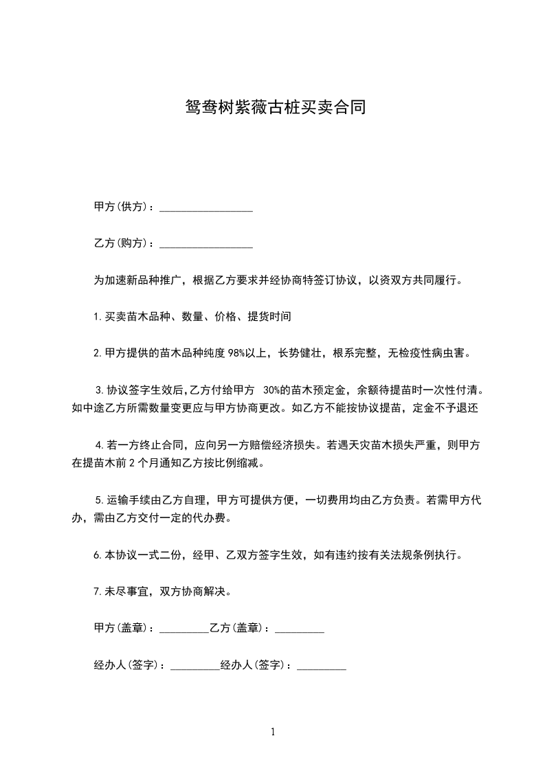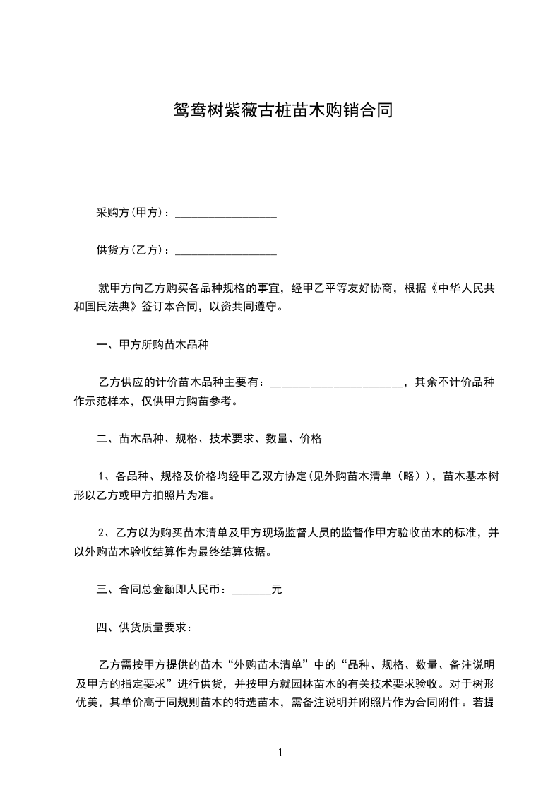 鸳鸯树紫薇古桩苗木购销合同