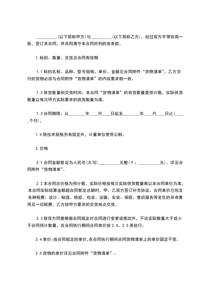 1、按双方签定的合同单价(合同签订后,在履约的过程中不因市场变化而调价)和实际供货的数量(双方签字确定)进行结算。