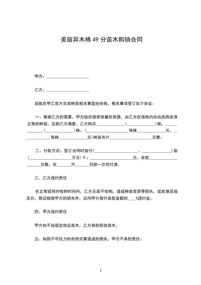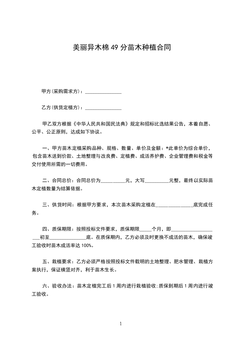 一、根据乙方的需要,甲方组织保质保量的货源,由乙方在场地内自由选购发育正常的树苗,达到乙方满意。乙方购买______________(______________)株,______________(______________)株。(_____________________每株______________元,______________每株______________元)树苗共计_____________________元整。