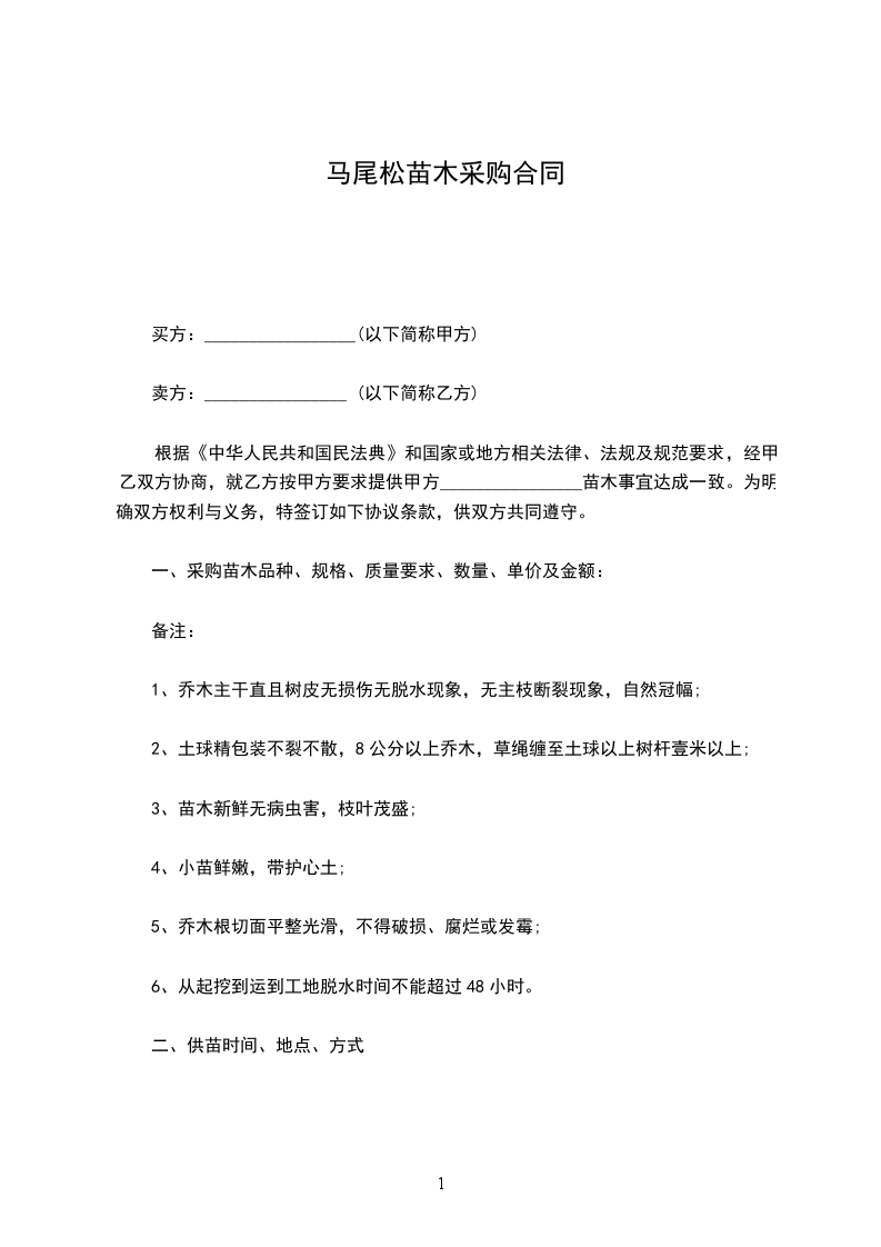 根据《中华人民共和国民法典》和国家或地方相关法律、法规及规范要求,经甲乙双方协商,就乙方按甲方要求提供甲方________________苗木事宜达成一致。为明确双方权利与义务,特签订如下协议条款,供双方共同遵守。