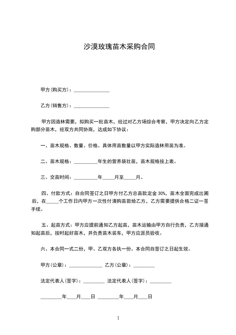 四、付款方式:自合同签订之日甲方付乙方总苗款定金30%,苗木全面完成出圃后,在_____个工作日内甲方一次性付清购苗款给乙方,乙方需要提供合格二证一签手续。