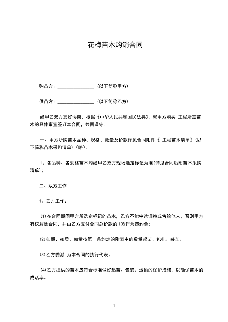 经甲乙双方友好协商,根据《中华人民共和国民法典》,就甲方购买 工程所需苗木的具体事宜签订本合同,共同遵守。
