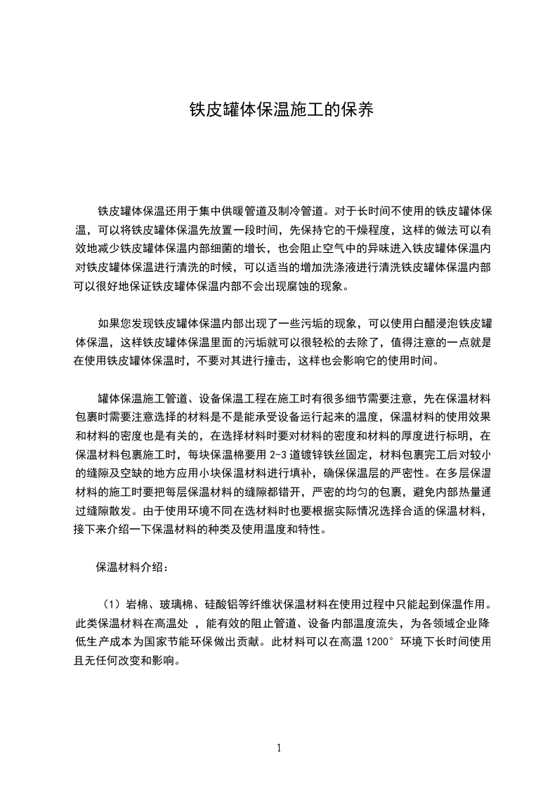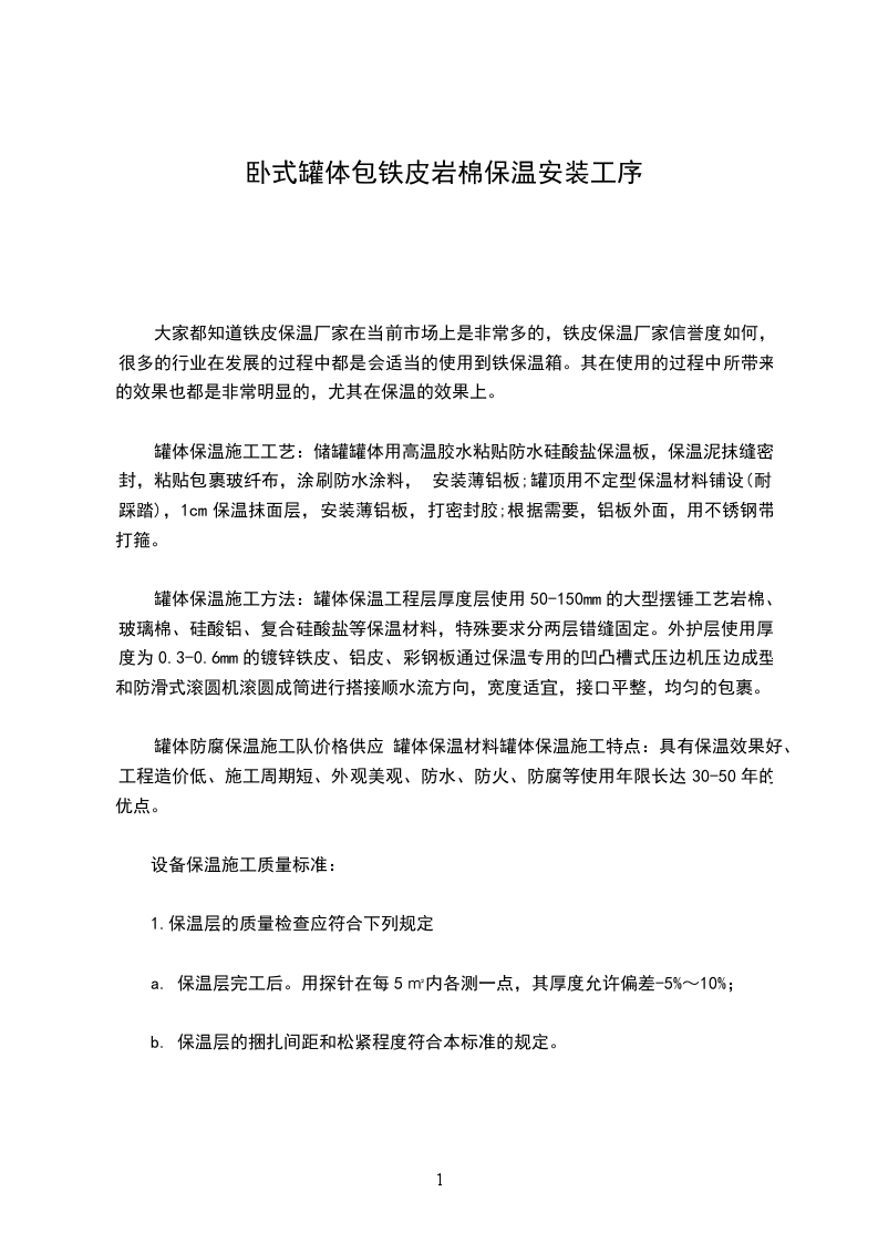 罐体保温施工方法:罐体保温工程层厚度层使用50-150mm的大型摆锤工艺岩棉、玻璃棉、硅酸铝、复合硅酸盐等保温材料,特殊要求分两层错缝固定。外护层使用厚度为0.3-0.6mm的镀锌铁皮、铝皮、彩钢板通过保温专用的凹凸槽式压边机压边成型和防滑式滚圆机滚圆成筒进行搭接顺水流方向,宽度适宜,接口平整,均匀的包裹。