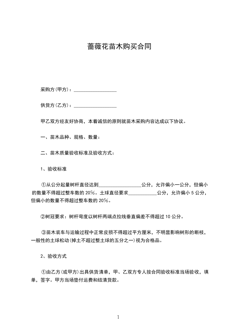 一、甲方向乙方采购苗木,具体的苗木品种为________________,规格为________________厘米,数量为________株,树龄为________年。