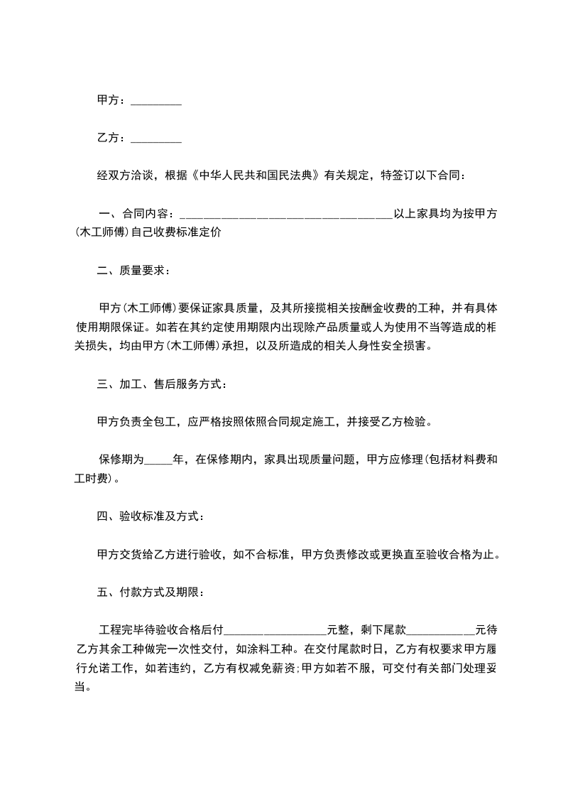 合同总金额:RMB 元,大写 元。其中定金5%计RMB 元,货款80%计RMB 元,由于定制产品的特殊性,甲方需在家具出厂前一次性付清剩余尾款15%计RMB 元。