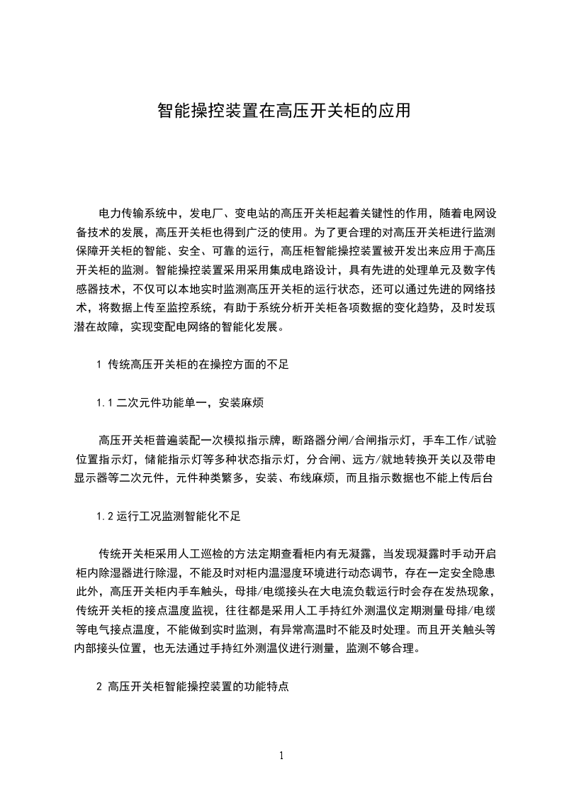 电力传输系统中,发电厂、变电站的高压开关柜起着关键性的作用,随着电网设备技术的发展,高压开关柜也得到广泛的使用。为了更合理的对高压开关柜进行监测,保障开关柜的智能、安全、可靠的运行,高压柜智能操控装置被开发出来应用于高压开关柜的监测。智能操控装置采用采用集成电路设计,具有先进的处理单元及数字传感器技术,不仅可以本地实时监测高压开关柜的运行状态,还可以通过先进的网络技术,将数据上传至监控系统,有助于系统分析开关柜各项数据的变化趋势,及时发现潜在故障,实现变配电网络的智能化发展。