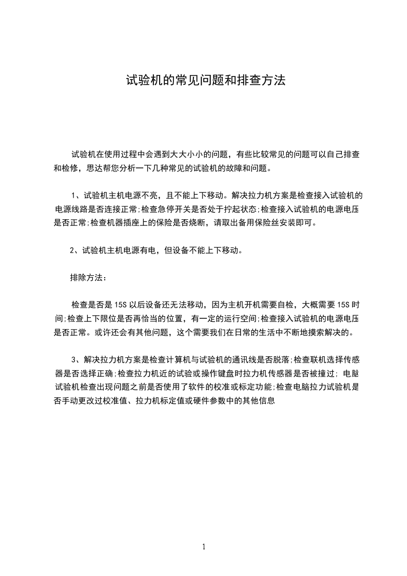 检查是否是15S以后设备还无法移动,因为主机开机需要自检,大概需要15S时间;检查上下限位是否再恰当的位置,有一定的运行空间;检查接入试验机的电源电压是否正常。或许还会有其他问题,这个需要我们在日常的生活中不断地摸索解决的。