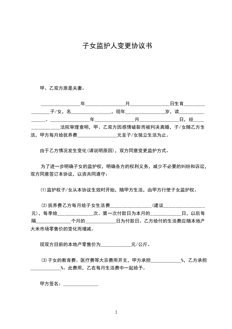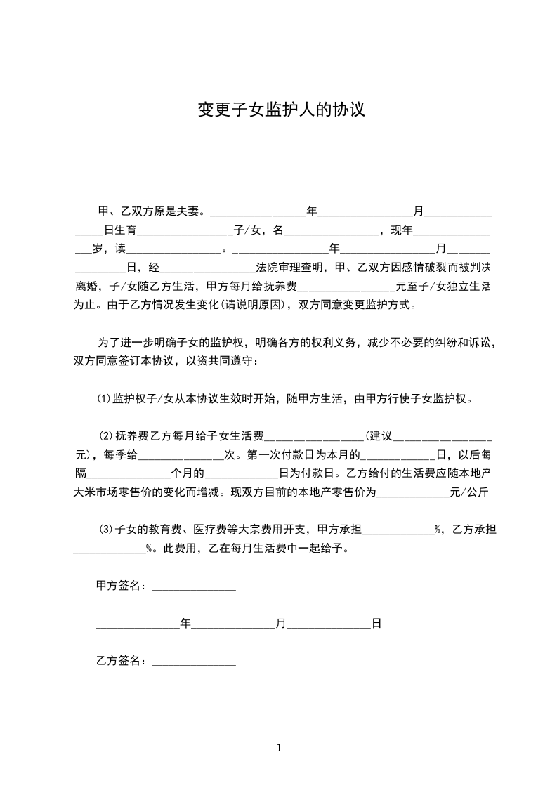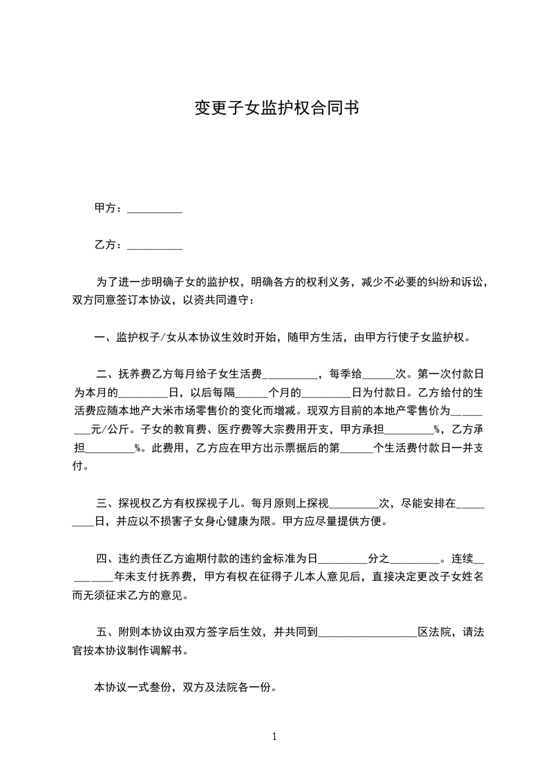 1、监护权子/女从本协议生效时开始,随甲方生活,由甲方行使子女监护权。
