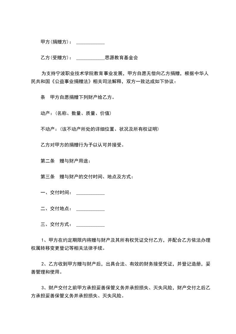 第三条甲方应按下述时间、地点及方式向乙方交付捐赠义款: