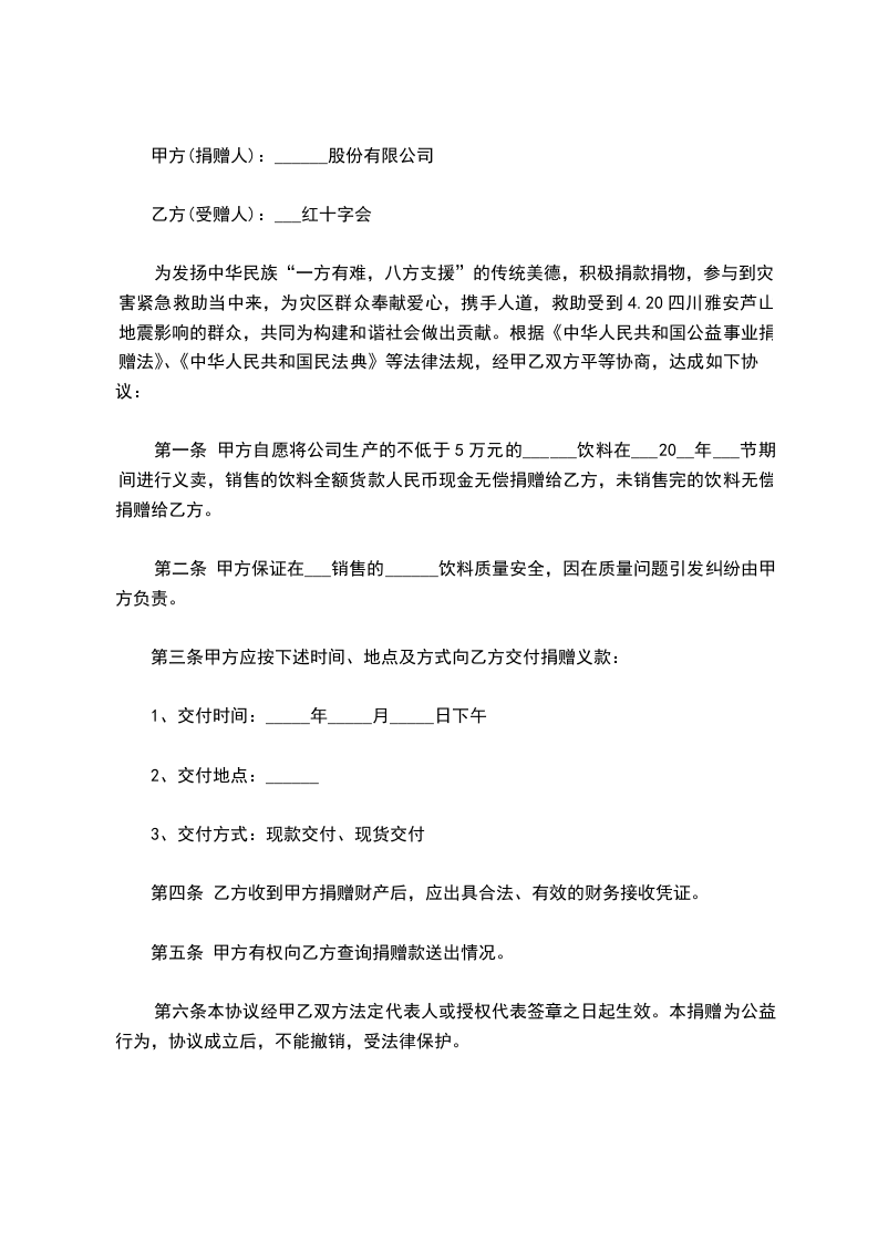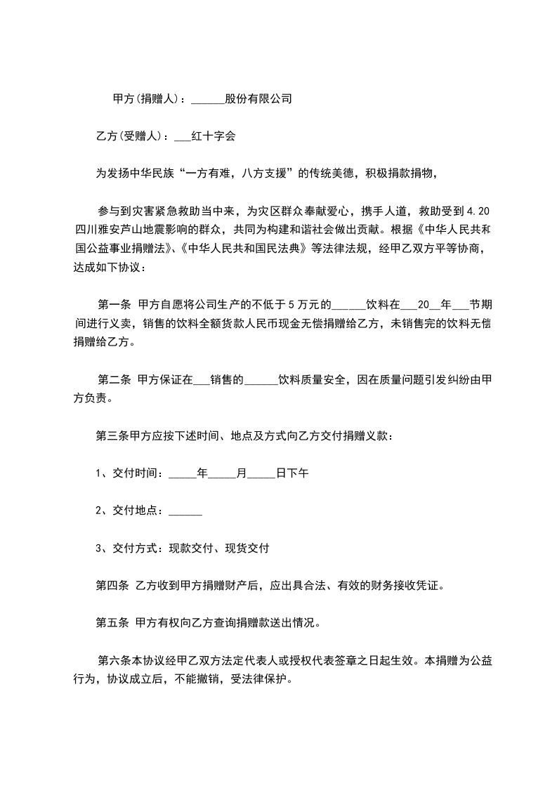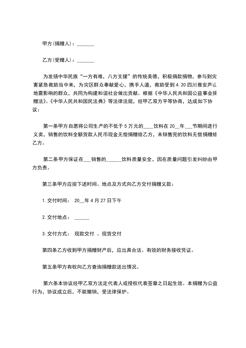 第一条甲方自愿将公司生产的不低于5万元的______饮料在___20__年___节期间进行义卖,销售的饮料全额货款人民币现金无偿捐赠给乙方,未销售完的饮料无偿捐赠给乙方。
