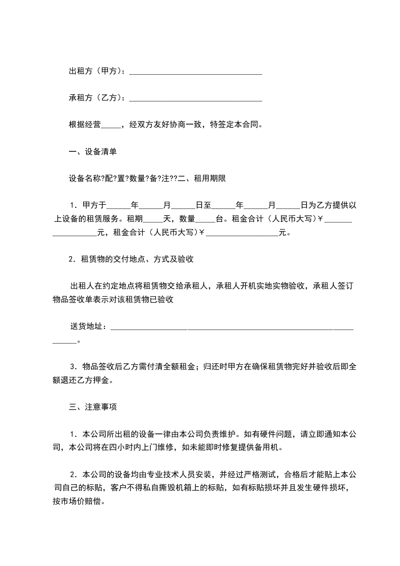 1.本公司所出租的设备一律由本公司负责维护。如有硬件问题,请立即通知本公司,本公司将在四小时内上门维修,如未能即时修复提供备用机。